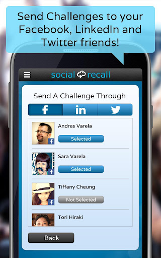 Play Social Recall by yourself or in multiplayer mode by challenging friends from Facebook and Twitter to see who has the best name memorization skills!