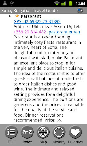 MobileReference Travel Guides provide detailed, practical information about attractions, landmarks, transportation, cultural venues, dining, lodging, history and much more. They are indexed alphabetically and by category, making it easier to access individual articles. Attractions can be viewed on an offline GPS map along with your current location so that you can easily find attractions near you as you explore the city.