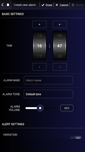 ☆ Advanced alarm settings - Increasing melody duration (time in seconds until alarm sound reach max volume), auto dismiss duration (preventing alarm to play music too long), play alarm sound when device is in silent mode