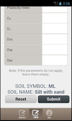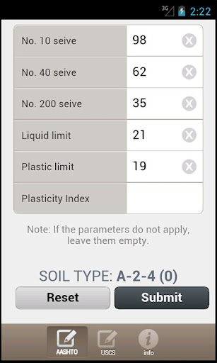 This app is perfect for Civil Engineering majors, especially Geo-Engineering. The USCS shows you the soil's symbol and name. The AASHTO classification system shows you the soil type and G-index.