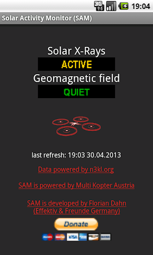The Solar Activity Monitor (SAM) is an indispensable tool for all Multicopter aka. Mikrokopters pilots and people who are dependent on the reliability of the GPS system and the accuracy of magnetomical sensors. The data is updated every 10 minutes from http://www.n3kl.org.