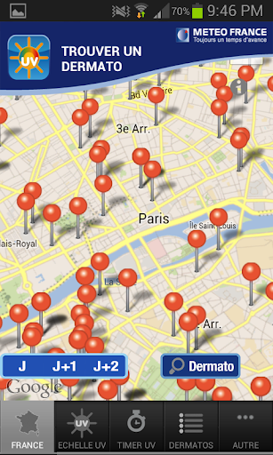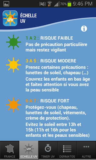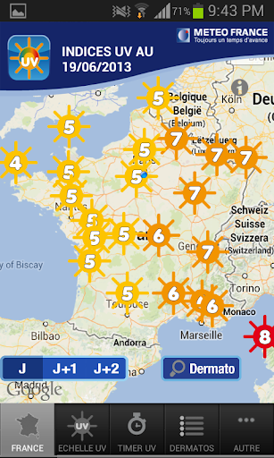 Développée par le Syndicat National des Dermatologues en partenariat avec Météo France, Soleilrisk permet d'obtenir les indices UV du jour sur l'ensemble du territoire, les règles de protection à mettre en œuvre quand le soleil peut être dangereux.