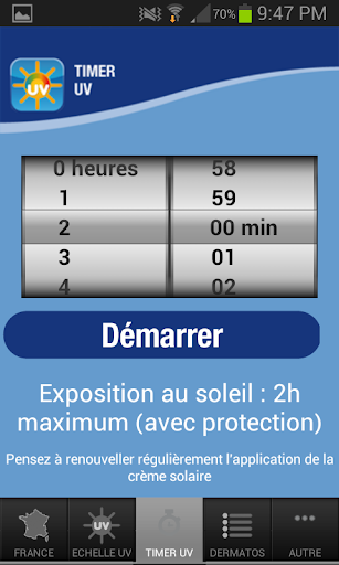 A l'ouverture de l'application, l'utilisateur accède directement à l'indice UV de sa région (par géolocalisation) au jour J ainsi qu’à J+1 et J+2. Il peut zoomer sur la carte de France pour accéder aux indices des autres régions. Au total, 300 villes sont ainsi répertoriées. Il peut aussi recevoir si il le souhaite des alertes en cas d'indice UV élevé.