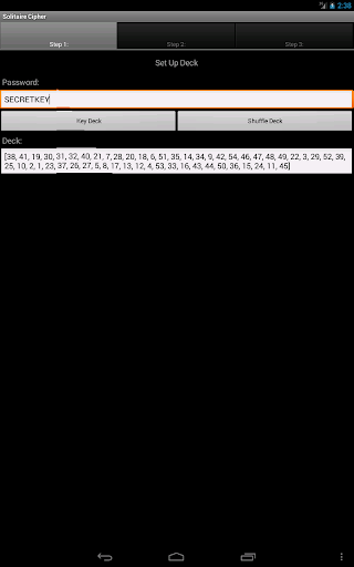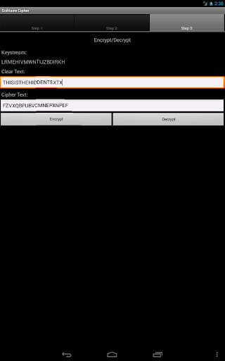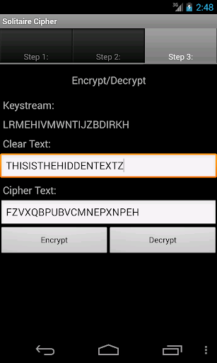 Solitaire Cipher is an implementation of The Solitaire cryptographic algorithm. It was designed by Bruce Schneier "to allow field agents to communicate securely without having to rely on electronics or having to carry incriminating tools." The Solitaire algorithm can be done by hand using a deck of cards or even in your head. Solitaire is designed to be secure even if people knows how the algorithm works. It offers real security, not security through obscurity.
