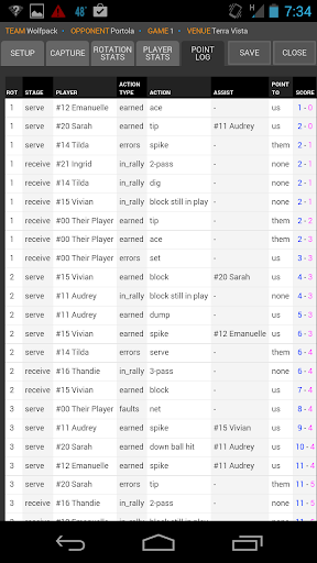 SoloStats focuses on capturing actions that result in points, either for or against. It takes less than 3 seconds between rallies. You can also use SoloStats to capture in-rally stats for pass rating, and attack and dig attempts.
