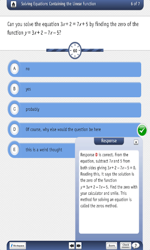 The apps consist of lessons created as multiple-choice questions, and when you answer a question, you receive an immediate response. Unlike multiple-choice tests, the app lessons use multiple-choice questions as a teaching tool. The “Algebra through Function” series contains five (5) apps and has 41 embedded lessons.