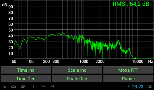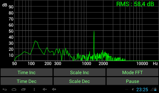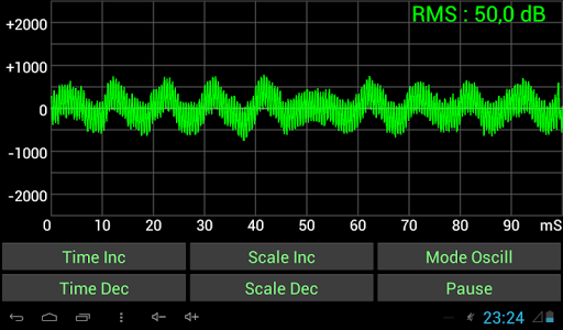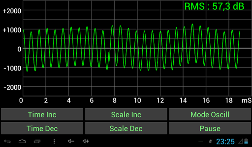 This program turns your device into a simple oscilloscope function of the spectrum analyzer, signal source is the microphone input of your device. With this program you will be able to compare the level of noise (sound) in different areas or from different sources, as well as to determine the spectrum of audio signals. You can take a picture signal by moving the program mode pause and examine in greater detail the form and spectrum of individual sections of the signal.