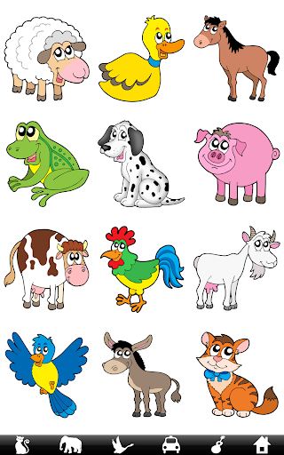 程序启动后直接进入游戏界面,没有主菜单。 游戏设置了6个分类,在屏幕下方用图标表示,分别为:动物、野生动物、野生鸟类、运输工具、乐器以及居家。 每个页面显示12个项目,均是活泼可爱的卡通图形。 轻击任何一个图片,马上会弹出一张实物照片,并且伴随实物发出的声音。 轻击照片任何位置,照片会自动消失。