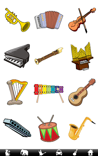 乐器部分配以著名的古典音乐乐曲 - 您的孩子可以轻击钢琴或小号的图片,然后听到5段不同的演奏。 轻击鼓的图片,则分别显示套鼓、手鼓、军鼓和定音鼓。 另外还有轮船和消防车、绵羊和猴子、手风琴和口琴等等,这个游戏应该能让孩子们玩儿很长时间而不会感到厌倦!