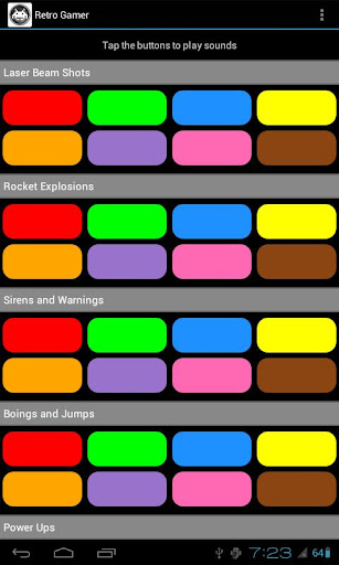 This app follows a similar layout to the keyring devices, only instead of one set of sounds you get 6 sets! Each set is based on different types of sounds to provide hours of fun. The sounds are not sampled from classic consoles, they are synthesized using desktop software to mimic the style of old computer games.