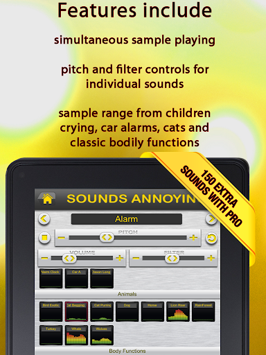 If you've every wanted to annoy your parents, wife, kids, work colleagues and anyone else within earshot, then this app might be your answer to your dreams. Contains pitch, filter and volume alterations. Looping and simultaneous playing of annoying sounds effects with simple controls. Best of all its FREE, so download Sounds Annoying now and starting annoying.