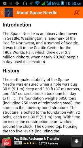 Monuments are the pride of the country they belong to. This Space Needle app will provide you all the details about the famous monument. The Space Needle is situated in Seattle and is an observation tower. It is built to withstand winds of up to 200 miles per hour and earthquakes of up to 9.1 magnitude. It has an observation deck at 520 ft and a gift shop with the rotating SkyCity restaurant at 500 ft. The view from the top is splendid.