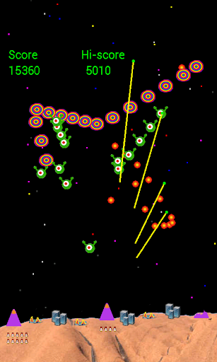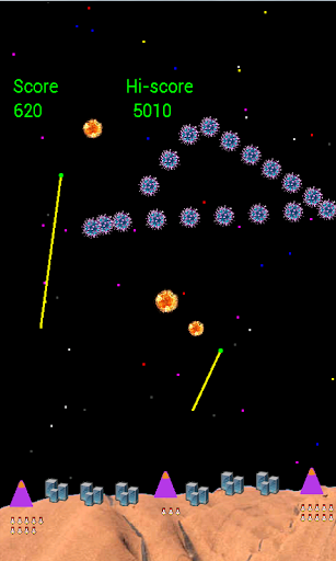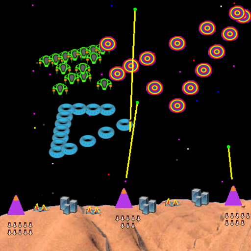 Your task is to destroy them and defend against the kamikaze invaders that dive bomb your cities.