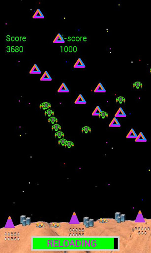 The aliens stream onto the screen like giant space trains, growing in length the further you progress. Your task is to destroy them and defend against the kamikaze invaders that dive bomb your cities.