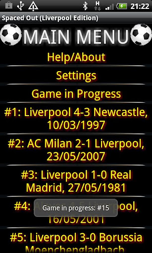 SPACED OUT is a trivia game for football fans. The aim of the game is to complete the starting line-up for the match specified by entering 11 player's names into the 11 text boxes on the game screen. At the start of the game, each player's name has been disguised by replacing all alpha characters (A to Z) by a question mark (?). The game is complete when all 11 players names have been correctly entered into the 11 text boxes.