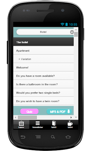Essentials, Conversation, Looking for someone, Time tracking, Parting, Bar, Restaurant, Taxi, Transportation, Hotel, Beach, Family, Feelings, Learning, Colours, Numbers, In case of trouble,