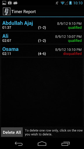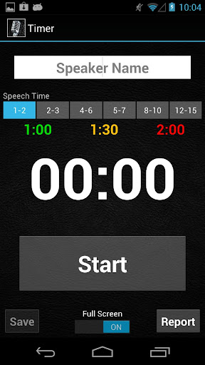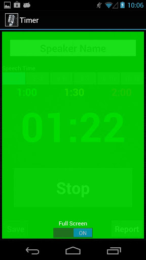 SpeakApp Timer is tailored to Toastmasters speeches which have specific allowed times. Select the desired speech time and hit Start to start the timer. Switch ON the fullscreen mode to display the green, amber and red signs to the speaker. After stopping the timer, click on Save to save the time record. Saved records can be viewed in the Timer Report. The Timer beep sound can be switched ON or OFF in the Settings section.