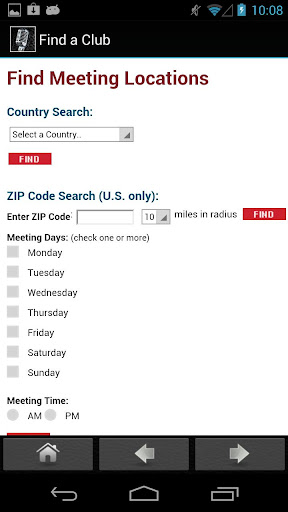 Visiting a new country, and wish to attend a Toastmasters meeting? SpeakApp includes the Find a Club page from Toastmasters International's website to help you locate clubs near you. Enter your location and meeting time preference to select among the available Clubs in your area.