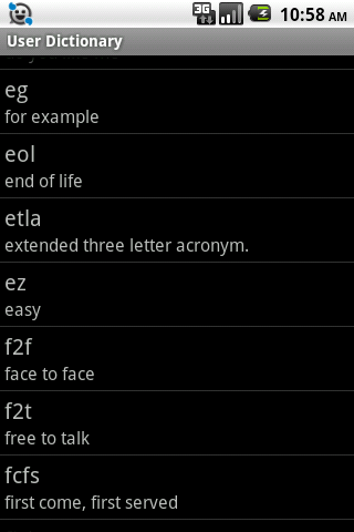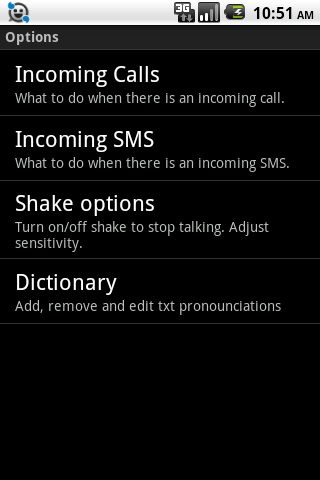 Dictionary: Incoming SMS messages are automagically translated from txt to full text before being spoken.