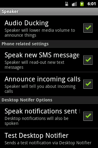 * Speak Desktop Notifications. If an app supports "desktop notifications" via this app: https://market.android.com/details?id=org.damazio.notifier then they will automatically be read out by Speaker if you wish!