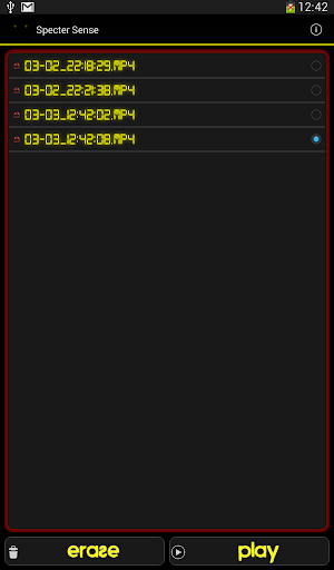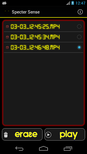 The main ghost hunting display records video and audio, provides access to 3-axis magnetic field sensor, thermometer and a graphic widget. Videos are saved so you can revisit your close encounters. Whether you just heard a noise in your room, or you're a seasoned investigator, Specter Sense has you covered!