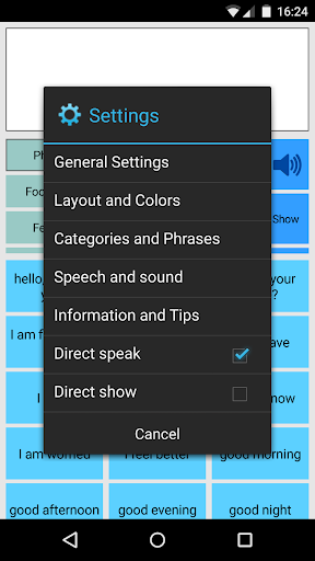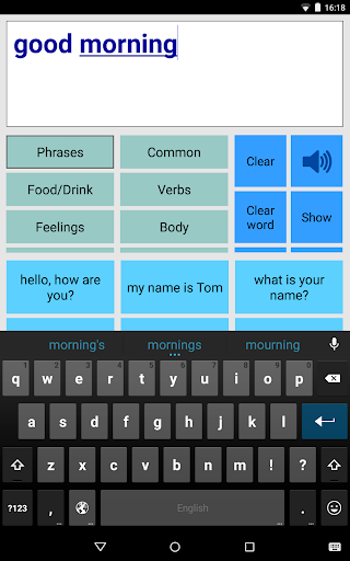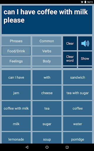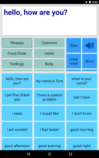 With the app you can create categories, words and phrases, which are placed on large buttons. With these buttons you can create messages that can be shown or spoken. It is also possible to type any text using the keyboard.