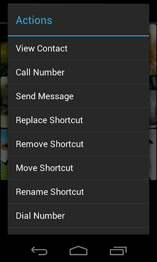 A: If you have set up your contact shortcuts, two main actions can be performed. A short or a long click. By default a short click calls the number stored in the shortcut and a long click opens the context menu to start different actions like call number, send text message, view the contact, send a WhatsApp message, show the contact's address in Google Maps, send Email and also replace, remove or move a shortcut. Short and long click actions can be overwritten with other actions. Please note, if you change the 'Long Click Action', the context menu will not be available anymore. Instead you can use 'Actions' from the main menu.
