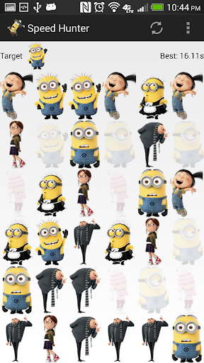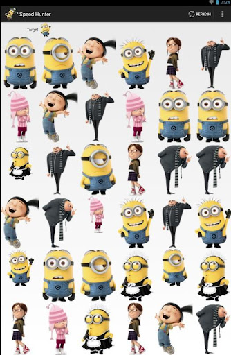 It's a simple and easy to play game. A target character displays at top and you need to "hunt" all characters from the 36 randomly located images. The next target character will show when you have hunted all characters that match the focus character. If you finish all hunts within 20 seconds then your performance is good. If not you need to play faster. Challenge yourself to the limit. (Note: the characters are from Despicable Me and all the icons are from iconarchive. All the rights are reserved by the corresponding owners.)