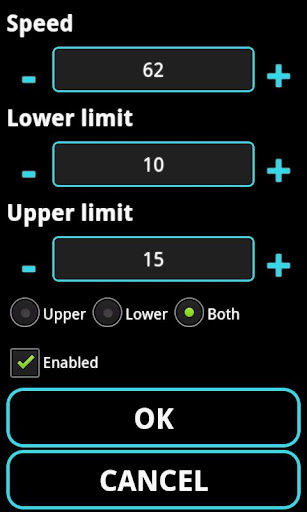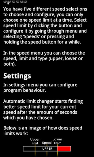 Very easy to use speed limiter application. Application gives you five different speeds to choose from and gives an alert if you're not inside of your current active speed limit's ranges. Very customizable, automatic limit changer included.