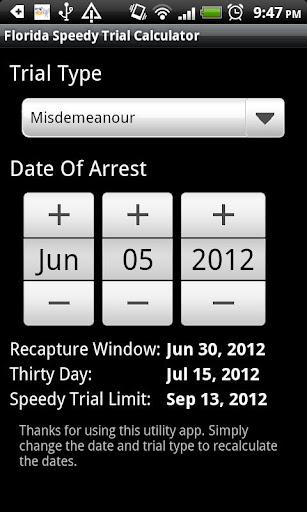 This app is specifically to aid Attorneys, Lawyers and Paralegals practicing in Florida, USA. This app provides you instantly with the necessary dates your require when calculating the Thirty Day date, the recapture window and Speedy trial Limit according to a given date of arrest and trial type.