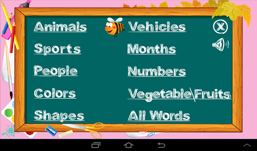 Spell With Me is a interactive Game targeted from KG students up to Grade II kids primarily to enhance the spelling abilities.This unique game has many words to practice the spelling skills with attractive pictures.The game provides various categories for the word like people, shapes, colors, vehicles, sports, fruits, Animals, months, numbers etc.This is great learning game for kids with lot of fun.