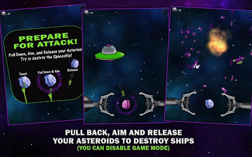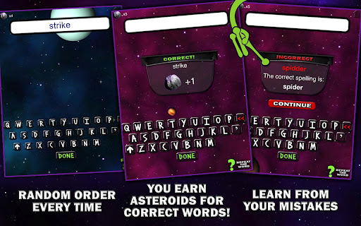 -Earn asteroids during gameplay as you correctly spell words! At intermission and end of gameplay you get to fire your asteroids at the spaceships flying by! (See if you can destroy the ship with multiple hits.)