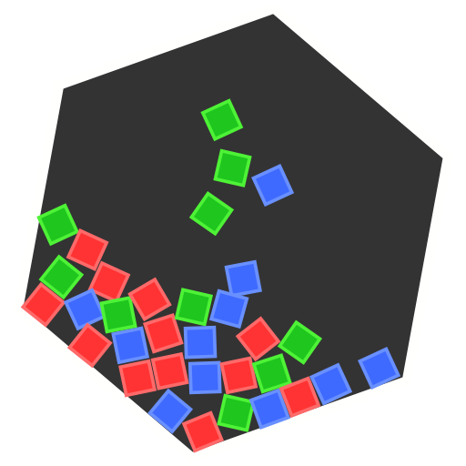 The hexagon spins, blocks fall down. Poke groups of three or more of the same colour, to make them vanish and get points. Don’t let your hexagon fill up.