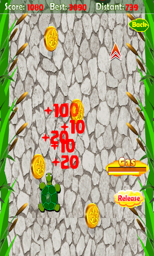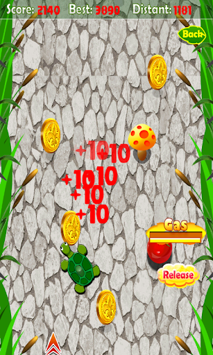 Dive into adventure and fun with this cute turtle , use the catapult to launch the turtle to her gurney, collect gold coins, tomatos and mushrooms as possible, and avoid obstacles.
