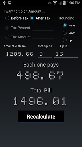This is a simple and beautiful tip calculator with Holo Dark Theme. It calculates the tip amount and the split amount by allowing you to enter tax percent or tax amount optionally. Get all this for free and without any distracting ads. Please email us if you have any problem with your device and we will make it right for you.