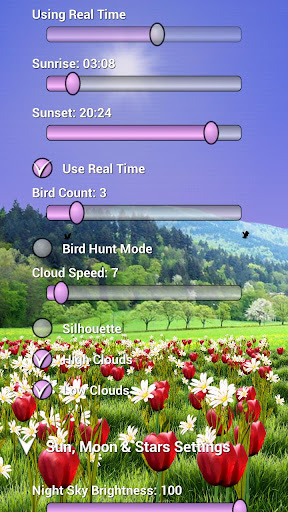 Colorful spring flowers in the green grass of this spring meadow live wallpaper. Birds in the air and a live sky with clouds, sun and moon depending on the time. Supports horizontal scrolling on all devices.