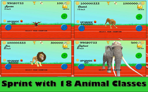 In the game included 18 animal sprinters at their real speed, which can be upgrade to reach even higher speed.
