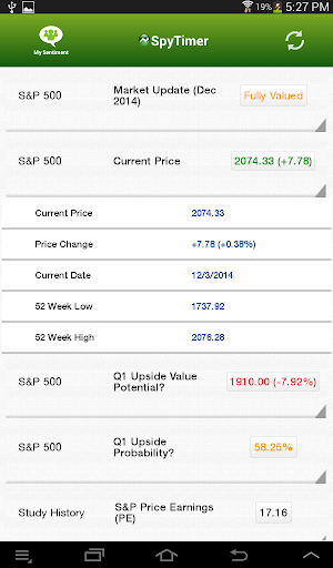 Unlike the other stock quote or portfolio apps the SpyTimer team does monthly manual research of economics, sentiment, and PE and provides an estimated target value price based on history. Learn to care about the % away from an estimated target price and NOT the day to day S&P500 price/percentage changes which are meaningless without perspective. Value is important. Over the long run the market has tends to revert to it’s average of 15-16 PE. Guessing short term is a nearly impossible losers game. Play the long term winner's game instead.