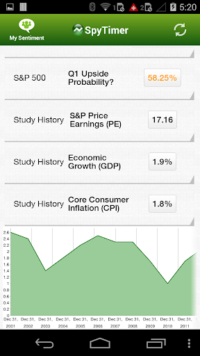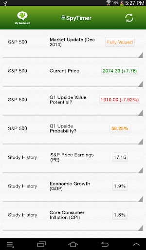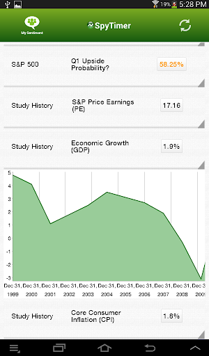 SpyTimer helps you become your own financial advisor by providing monthly updates on our 6 month estimated 'value' price for the S&P500 index. Each month we analyze the latest economic information from key sources and project our S&P500 value outlook. Keep it simple and use the app to assist you in decisions you make for buy (or sell) opportunities. SpyTimer helps you to better understand the factors that truly drive the long term value of the S&P500 and current market risk. SpyTimer factors include current economic data, earnings estimates, and market sentiment. New users try the free premium trial and becoming part of our SpyTimer community! Share your sentiment, see and collaborate with other SpyTimer users, and gain full exclusive access.