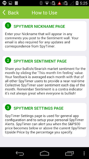 The S&P 500 stock market investment information provided within SpyTimer is provided in good faith. Such S&P 500 information is believed to be accurate, but no representation or warranty is being made as to its accuracy and completeness. SpyTimer reserves the right to update or supplement the content for this App, or to correct any error or omission with respect to any information provided within the App including historical stock market, S&P 500, and/or economic information. The app is intended to help you invest in stocks through the use of S&P 500 stock market index to be your own stock market financial advisor.