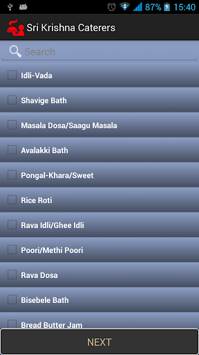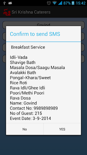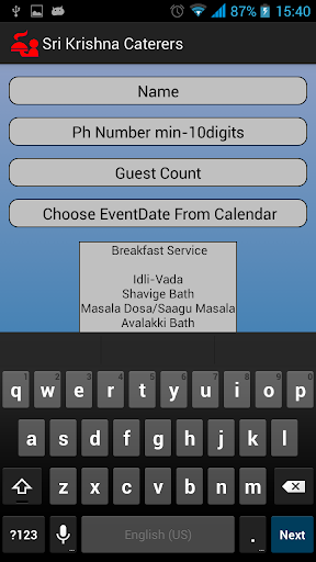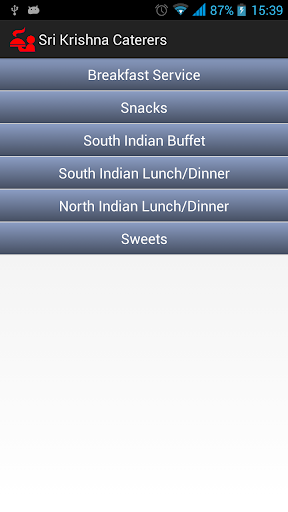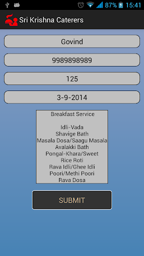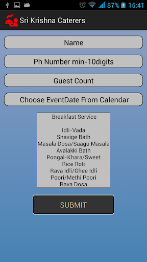 Sri Krishna Caterers is a product catalog of various food catering services offered by the company in Bangalore. The app has a selection for Breakfast items, Lunch/Dinner items, Snack items, Sweet items etc. Customers who are looking for a good quality vegetarian caterer in Bangalore can select the various food items required for their function. The Caterer will receive an SMS and respond to your request by calling the customer directly.