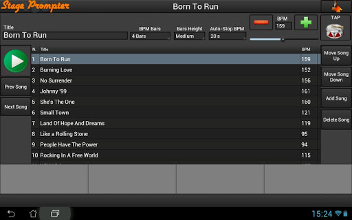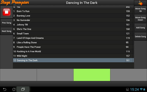Stage Prompter è un metronomo flessibile e completamente configurabile, sia per telefono che per tablet. Stage Prompter consente di gestire una setlist e il metronomo per ognuna delle canzoni in scaletta, con l'indicazione visuale del metronomo.