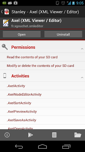 With it, you can explore packages installed on your device, read the package informations (permissions, features, activities, services, providers and receivers), export the package's manifest and explore the package's resources.
