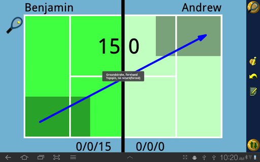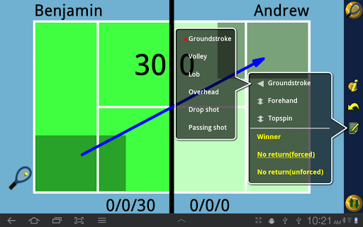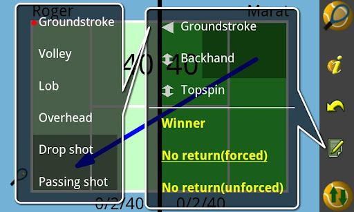 Starting with tracking simple, scoring shots, you can enrich final statistics by recording "first serve faults", shot characteristics, and comments.