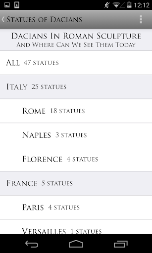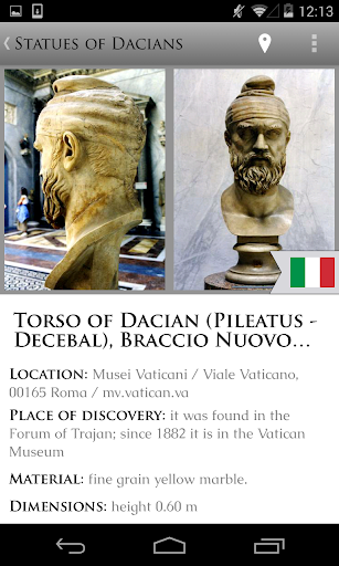 Inseamnă o aplicatie în care am încercat să alăturăm texte, fotografii și locații ale statuilor romane ale dacilor, și ei strămoși ai poporului român, statui care se găsesc în diferite colecții private și muzee celebre din lume.