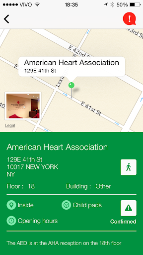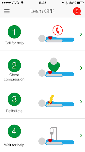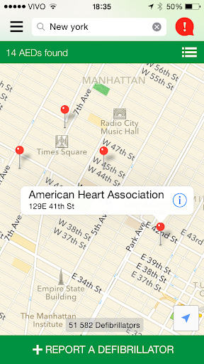 In case of emergency, Staying Alive guides you through the different steps of the survival chain (call emergency, give chest compressions and defibrillate) while it looks for the closest AEDs.