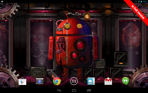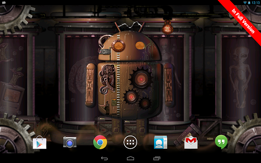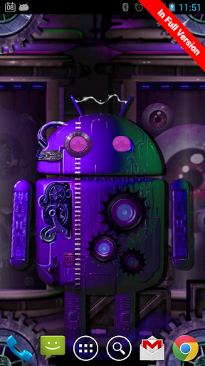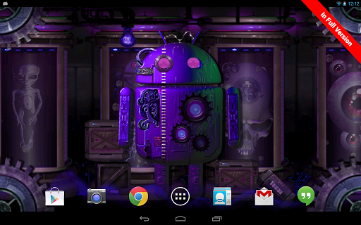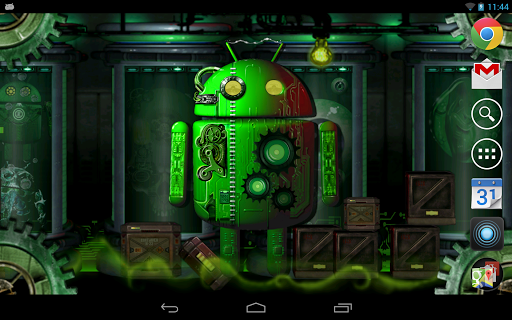 Live Wallpaper featuring a Steampunk Droid Fear Foundry - a droid lab technician hosts bubbling tanks filled with horrors and curiosities. Many details to discover and enjoy. With rotating gears, clockwork, parallax scrolling and interactive touch effects. The gears spin and track your finger movements. The droid has random quirks and expressions and reacts to touch.