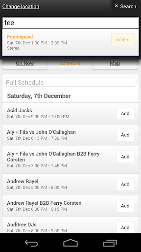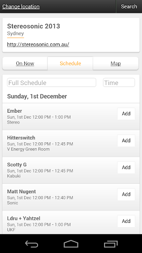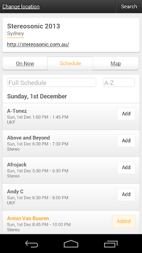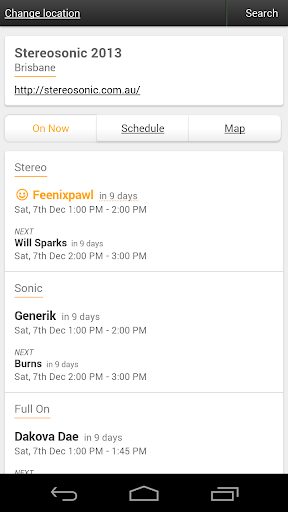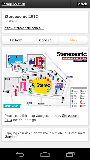 Bored? In between sets? Only Amigo lets you see instantly who is on stage anytime during the festival!