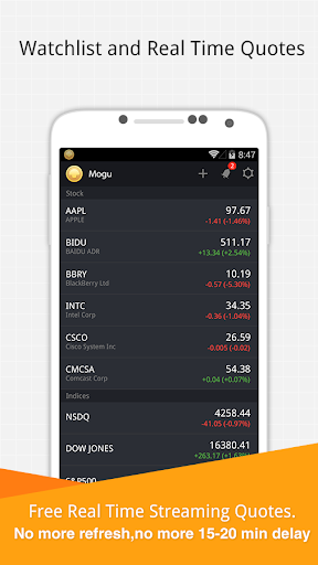 Finance for Android brings you streaming real time stock quotes and news in this application. It allows quick access to charts/dashboard and lets you view the latest market and company news and real time alert.