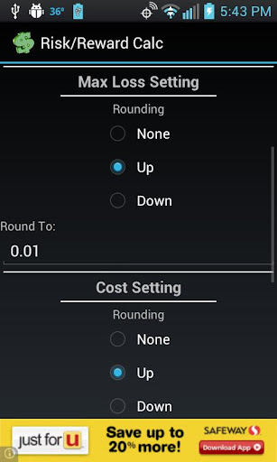 Calculate risk/reward and cost covered prices for stock purchases using share price, capital investment, cost to buy and sell, and loss and profit targets. Settings allow rounding preferences for share quantities, risk, cost, and reward prices.